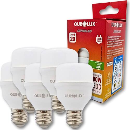 Kit 5 lampadas superled alta potencia ourolux 20w e27 6500k Lampada superled alta potencia ourolux t20w e27 6500k bivolt Descrição do produto Ilumine seu espaço com eficiência e estilo o superled alta potência ouro 20t 6500k é a escolha perfeita para quem busca uma iluminação potente e clara. Com uma temperatura de cor de 6500k, ele oferece uma luz branca fria que é ideal para ambientes de trabalho, escritórios, garagens e muito mais. Características - alta potência bivolt: proporciona uma iluminação intensa, garantindo visibilidade em grandes áreas. - longa durabilidade: vida útil prolongada, diminuindo a necessidade de trocas frequentes. - fácil instalação: design prático que se adapta a diferentes tipos de luminárias. - tamanho do produto: 10cm altura x 6cm largura x 7cm de diametro. - : 3 meses - composição: polímero termoplástico, metal e componentes eletrônicos. - certificação: inmetro - cor: branco frio - base de conexão: e27 - fluxo luminoso: 1600 lm - eficiência energética: 80 lm/w - potência: 20w Vantagens - longa vida útil: menos trocas e manutenção. - sustentável: menor impacto ambiental em comparação com lâmpadas convencionais. - design moderno: se adapta a qualquer decoração. Aplicações Perfeito para escritórios, lojas, fábricas, ou qualquer ambiente que necessite de iluminação clara e eficiente. Marca: Não Informado