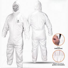 Macacão de segurança, confeccionado em tecido não tecido (TNT) de polipropileno com filme de polietileno micro poroso. Tratamento antiestético. Capuz de duas peças com elástico. Fechamento frontal com zíper bidirecional, sem aba protetora, elástico na cintura, punhos e tornozelos.