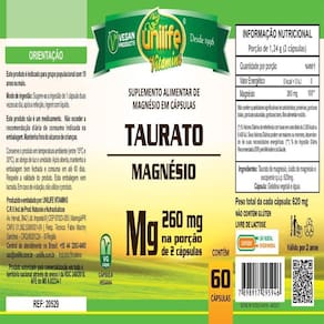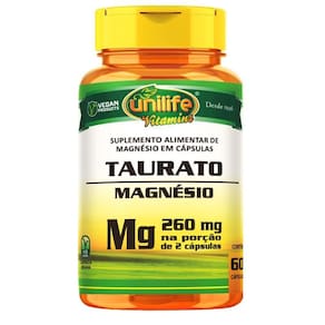 Kit 5 Suplemento Alimentar em Cápsula de Taurato de Magnésio Unilife 60 cápsulas 100% da Ingestão Diária Recomendada de Magnésio O Magnésio é um mineral que desempenha muitas funções biológicas em nosso organismo, está envolvido em vários sistemas enzimáticos e na contração muscular. Este mineral também interfere no humor, quando os níveis estão baixos a liberação de adrenalina é estimulada, o que deixa a pessoa mais agitada, aumentando a secreção de cortisol que é conhecido como o hormônio do , quando o magnésio está equilibrado incentiva a produção de serotonina que é responsável pela sensação de bem-estar. Junto do fósforo e cálcio, está presente nos ossos, embora em menores quantidades, porém a falta deste nutriente pode levar à fragilidade dos ossos. O taurato de Magnésio é um suplemento resultado da complexação do magnésio à taurina. A Taurina é um aminoácido produzido pelo nosso fígado, importante para o desenvolvimento do sistema nervoso e para a saúde dos olhos. Benefícios do uso de Taurato de Magnésio em cápsulas: Tem relação com os hormônios do bem estar; Essencial para o bom funcionamento do organismo; Está presente nos ossos esqueleto e dentes, promovendo a absorção do cálcio; Tem relação com a contração e o relaxamento muscular. Como usar o Taurato de Magnésio em cápsulas Sugere-se a ingestão de 1 cápsula, duas vezes ao dia, após a refeição. Ingerir com líquido. Ingredientes do Taurato de Magnésio em cápsulas Taurato de magnésio, óxido de magnésio e excipiente .S.P 620mg. Cápsula: gelatina vegetal e água Marca: Não Informado Ean: 7908609503904