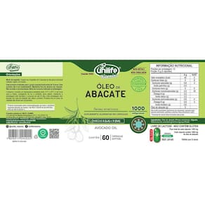 Óleo de abacate 60 cápsulas 1200mg - unilife O óleo de abacate unilife é um suplemento em cápsulas à base de óleo de abacate, que por sua vez é rico em gorduras do bem, como o ácido oleico ômega 9 , luteína, vitaminas e minerais. Além disso, é enriquecido com 4 vitaminas lipossolúveis a, d, e, k , que melhoram a absorção do produto. Benefícios do óleo de abacate: Contém ingredientes naturais; Oferece 100% da recomendação de ingestão diária de vitamina e em apenas uma porção; Oferece 50% da recomendação de ingestão diária das vitaminas a, d e k em apenas uma porção; Fácil e prático para o consumo; Modo de usar: Sugere-se a ingestão de 2 a 4 cápsulas ao dia, após a principal refeição. Ingerir com líquido. Ingredientes: Óleo de abacate, gelatina e umectante glicerina. Marca: Não Informado