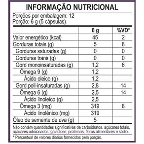 Possui ômega-6 e 9, além da vitamina e, que possui ação antioxidante nas células. Modo de ingestão: sugere-se a ingestão de 2 cápsulas ao dia, após a principal refeição. Ingerir com líquido. O ministério da saúde adverte: não existem evidências científicas comprovadas de que este alimento previna, trate ou cure doenças. Ingredientes: óleo de semente de uva. Cápsula: gelatina bovina, umectante glicerina e água.