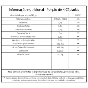 Os ácidos graxos ômegas-3 fazem parte da composição da membrana celular e participa do sistema imune. O organismo humano não é capaz de fabricá-lo, por isso é necessário a ingestão através da alimentação. Os peixes são as maiores fontes desses ácidos, principalmente aqueles retirados de águas profundas e frias. Não contém quantidades significativas de carboidratos, fibra alimentar e sódio. Ingredientes: Óleo de peixe. Modo de ingestão: Sugere-se a ingestão de 2 a 4 cápsulas ao dia, após as refeições. Ingerir com líquido. Pessoas alérgicas a peixes e crustáceos devem evitar o consumo deste produto.Pessoas que apresentem doenças ou alterações fisiológicas, mulheres grávidas ou amamentando (nutrizes) deverão consultar o médico antes de usar o produto._x000D_