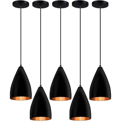 Kit 5 Pendentes Vegas Preto Textura / Cobre R.R.J.V Kit 5 Pendentes Vegas preto Textura / Bronze Lustre Pendente Modelo: Vegas Cor: Preto Com Interior Cobre Medidas Aproximadas: Altura: 18 cm Diâmetro: 15 cm Canópla de teto: 12 cm Soquete e-27 plástico Material: alumínio Marca R.R.J.V Negócios O pendente acompanha 1 Um Metro de fio com altura ajustável. Marca: R.R.J.V. Negocios
