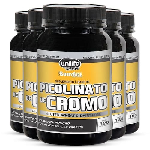 Kit 5 Picolinato de Cromo Unilife 120 Cápsulas O Picolinato de Cromo BodyAge Unilife Vitamins é um suplemento VEGANO, desenvolvido a partir de do cromo e ácido picolínico. Livre de glúten. Características: - Livre de Glúten. - Vegano. Modo de Uso: Sugere-se a ingestão de 1 cápsula ao dia, após a principal refeição. Ingerir com líquido. Ingredientes: Picolinato de cromo e excipiente .S.P. 500mg. Cápsula: gelatina bovina e água. NÃO CONTÉM GLÚTEN. Avisos: - Este produto não é um . - Não exceder a recomendação diária de consumo indicada na embalagem. - Manter fora do alcance de crianças. Marca: Não Informado