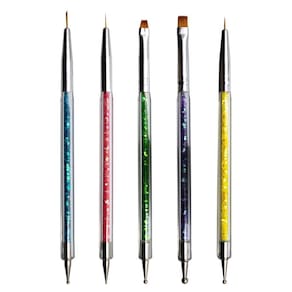 desenvolvidos para decoração de unhas e alongamentos como de gel, acrílico e porcelana. Permitem a criação de lindos desenhos, modelos, traços, rabiscos, linhas, bolas, formas, pinturas artísticas, one stroke e nail art em unhas naturais ou artificiais. Cada pincel acompanha um boleador de diversas espessuras para atender diferentes necessidades. Ideais para manicure, pedicure e designers de unha. Os pincéis possuem 5 cores diferentes com detalhes em glitter. Pincel de unha nº 00