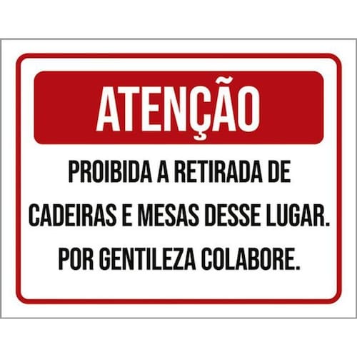 Kit 5 Placas Atenção Proibida Retirada Cadeiras Mesas 36x46 Placas de sinalizaço fabricadas com poliestireno de alto impacto PSAI de 2mm e impressão ultravioleta.