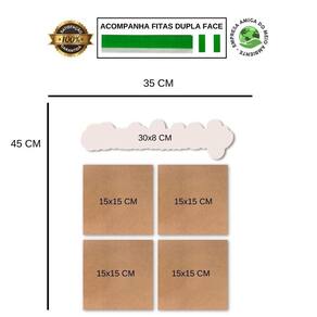 Tamanhos: 1 Placa Recorte Cantinho 30x8 cm (Plástico) e 4 Placas 15x15 cm (MDF).