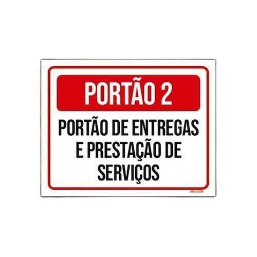 Kit 5 Placas Portão 2 Portão Entregas Prestação Serviços - Informações do Produto: Placas decorativas fabricadas com poliestireno de alto impacto PSAI de 2mm e impressão ultravioleta. - Medidas: 18cm x 23cm - Fixação: Todas as placas possuem adesivo dupla face para aplicação em qualquer tipo de superfície lisa. Garantia de 12 meses e disponibilidade imediata. Marca: Sinalizo