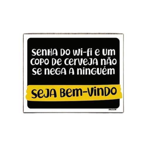 Kit 5 Placas Senha Do Wifi Copo Cerveja Bem Vindo - Informações do Produto: Placas decorativas fabricadas com poliestireno de alto impacto PSAI de 2mm e adesivo vinil automotivo de alta performance. - Medidas: 18cm x 23cm - Fixação: Todas as placas possuem adesivo dupla face para aplicação em qualquer tipo de superfície lisa. Marca: Sinalizo