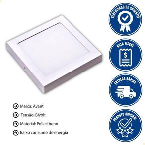 A vida útil estimada é de 25 mil horas e o fabricante oferece 12 meses de garantia contra de fabricação. Unidades por embalagem: 5 | Formato da luminária: Plafon | Lugares de montagem: Teto | Materiais: Poliestireno | Alimentação: Elétrica | Potência: 18 | Ambientes: Interno | Capacidade de lâmpadas: 1 | Tipos de fontes de luz: LED | Com wi-fi: Não | Voltagem: 127V/240V | Aplicações inteligentes compatíveis: Não | Tipo de luminária de teto: Não | É pendente: Não | Comprimento: 22 cm | Altura: 2.9 cm | Tipo de soquete da lâmpada: Não se aplica | Sem fio: Não | Autoadesiva: Não | Controle remoto: Não | Sistema de pressão: Não | Wi-Fi: Não | Assistentes virtuais compatíveis: Não | Principais Características do Produto: 0 | Regulamentações de produtos perigosos: 0 | Fabricante: Avant | Inclui lâmpadas: Sim | Cubagem: 0.010944 | EmbalagemComprimento-cm: 24 | Peso Líquido: 1.2500 | Marca: Avant | Dias Fornecedor: 0 | EmbalagemLargura-cm: 24 | EmbalagemAltura-cm: 19 | Modelo: Pop Sobrepor Quadrado 18W Br 6500k