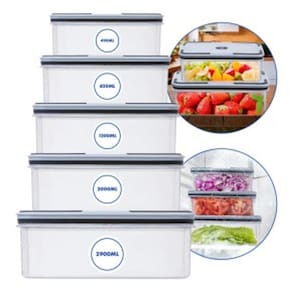 Conjunto de 5 potes para mantimentos com fechamento hermético. Fabricados em plástico transparente de alta resistência, os potes permitem a vedação completa do conteúdo, protegendo contra agentes externos. O kit é composto por 5 unidades com capacidades distintas: 490ml, 820ml, 1300ml, 2000ml e 2900ml. Indicado para armazenamento de grãos, cereais e alimentos secos ou prontos.