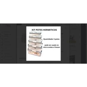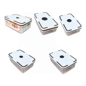 ESPECIFICAÇÕES TÉCNICAS Produto: Kit de Potes para Mantimentos Quantidade de Peças: 10 peças (05 Potes + 05 Tampas) Tipo de Vedação: Hermética Material: Plástico Transparente Transparente (Pote e Tampa) Capacidade Individual dos Potes: 01 Pote de 490 ml (17,5x9x4,5) cm; 01 Pote de 820 ml (17,7x11,3x5,5) cm; 01 Pote de 1300 ml (19,5x13,5x7) cm; 01 Pote de 2000 ml (22x15,5x8) cm; 01 Pote de 2900 ml (24x17,5x9) cm; Formato: Retangular Peso Total do Kit: 2 Kilos