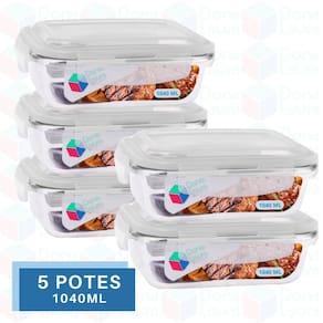 Kit 5 Potes Vidro Tampa Hermetico Anel Silicone 1040ml Retangular - Pote de Vidro