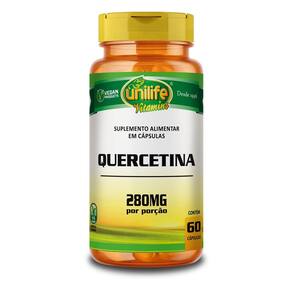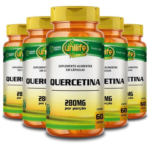 Kit 5 quercetina unilife 60 cápsulas Quercetina é um flavonoide derivado de planta, isolado de cebolas, maçãs, uvas, vegetais folhosos e chás, principalmente do chá verde camélia sinensis . É geralmente conhecido por suas propriedades antioxidantes e anti- inflamatórias. Modo de ingestão: sugere-se a ingestão de 2 cápsulas ao dia. Ingerir com líquido. Ingredientes: quercetina, celulose, antiumectante dióxido de silício. Cápsula: gelatina vegetal e água purificada. Peso total de cada cápsula: 310mg. Livre de lactose. Não contém glúten. Produto vegano. Marca: Não Informado