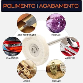 - Marca: Dremax - kit exclusivo com 5 rodas de pano - Diâmetro 25mm 1 Pol. - Espessura da roda: 4mm - Diâmetro da haste: 3mm - Comprimento total: 40cm - Uso em micro retíficas de qualquer marca com pinça de 3mm - Roda de pano de tecido 100% algodão natural - Indicada para polimento de metais ferrosos ou não ferrosos, aço, aço inoxidável, alumínio, bronze, cobre, latão e plástico em geral - Proporciona maior rendimento durante o trabalho - Recomenda-se a utilização com pasta para polimento - Garantia: 90 dias contra defeitos de fabricação