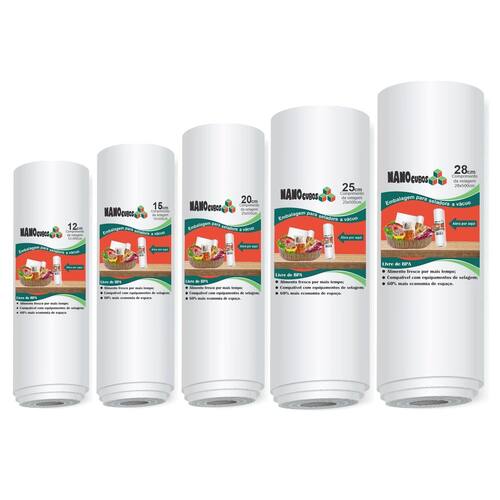 Kit 5 Rolos 12/15/20/25/28x500 Sacos Ranhura Seladoras Vácuo Embalagens 5 rolos: 12/ 15/ 20/ 25/ 28 cm x 500 cm NANOCUBOS para seladoras a vácuo. Embalar produtos a vácuo é a melhor forma de mantê-los sempre protegidos por muito mais tempo. Ao embalar alimentos, a validade deles é completamente estendida, pois eles não terão nenhum contato com o ar e serão pouco afetados pela ação do tempo. Você pode embalar tanto alimentos crus como alimentos já preparados para serem consumidos em outro momento. Você economiza muito dinheiro e evita o desperdício Os sacos para vácuo Nanocubos são produzidos com alta tecnologia em Nylon Poli seguindo padrões de qualidade internacional. Possuem 12 micras, 3 barreiras de proteção, sem presença de BPA Não tóxicos e funcionam com equipamentos de embalagens a vácuo. Além de alimentos, é possível utilizá-lo com objetos pessoais, documentos ou utensílios, conservando-os como novos por muito tempo e aumentando sua vida útil. Características do produto: - Aparência: Transparente com ranhuras; - Forma disponível: Rolos, é possível montar o tamanho que quiser; - Quanto ao uso: Reciclável pode utilizar várias vezes seguidas; - Iniciação ao rasgo: Difícil; - Propagação ao rasgo: Difícil; - Temperatura máxima de uso: 120C; - Resistência a ácidos: Excelente mantendo o cheiro do alimento; - Resistência a óleos e gorduras: Excelente; - Segurança alimentar: Conserva o alimento. Conteúdo da Caixa 5- Rolos: 12/ 15/ 20/ 25/ 28 cm x 500 cm. Políticas da loja: - : contra defeitos de fabricação, 90 dias; - Prazo de envio: imediato após a confirmação do pagamento; - Cancelamento: Realizamos a devolução total do dinheiro; Qualquer dúvida estamos à disposição Ean: 7896296946428