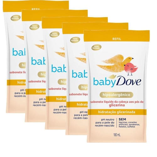O Kit contém: 5 Sabonetes Líquido Baby Dove Hidratação Glicerinada com 180ml cada Refil.