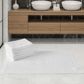 Com esse kit de toalhas de piso para hotel você poderá usufruir da sensação de aconchego e segurança que só toalhas de qualidade podem disponibilizar aos pés no pós-banho. O formato dos pés traçados na toalha de chão acomoda os pés e evita que a pessoa escorregue ou molhe o piso do banheiro.