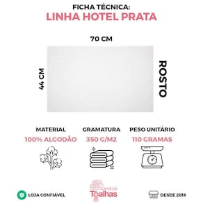 Características do produto Medidas: 44cm x 70cm Peso: 110 Gramas Gramatura: 350 g/m2 Material: 100% Algodão Modelo: Marca: Central Toalhas Garantia: Contra Defeitos de Fabricação