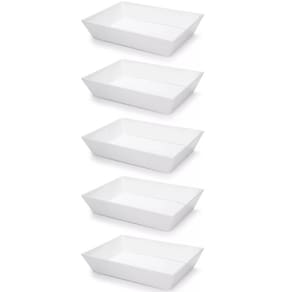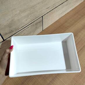 Garantia: 90 dias / Peso total: 1,220kg / Cor predominante: branco / Ref: 7798138563339; Dimensões de cada travessa retangular: 26,5cm (C) x 16cm (L) x 7cm (A); Capacidade de cada tigela: 2,2 litros; Material: polipropileno; Conteúdo: 5 travessas brancas.