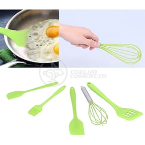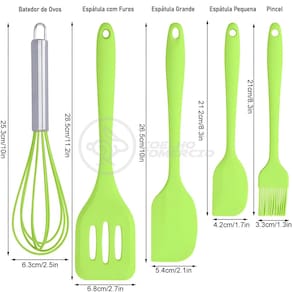 Dê um toque de modernidade e eficiência à sua cozinha com o nosso Kit de Utensílios de Cozinha em Silicone. Cada conjunto contém 5 utensílios essenciais, projetados para simplificar todas as suas tarefas culinárias. Vantagens: Saúde Ambiental: Fabricados com material silicone de alta qualidade, esses utensílios são uma escolha sustentável para a sua cozinha, ajudando a reduzir o desperdício. Saúde e Segurança: Livres de BPA e outros produtos químicos nocivos, esses utensílios garantem que você cozinhe com total segurança, protegendo a saúde da sua família. Fácil de Limpar: Graças à sua superfície lisa e antiaderente, esses utensílios são incrivelmente fáceis de limpar, poupando tempo e esforço na sua rotina diária. Fácil de Usar: Com design ergonômico e leve, esses utensílios são confortáveis de segurar e manusear, tornando suas atividades na cozinha mais simples e agradáveis. Características Cor: Verde; Materiais: Silicone e Metal (Batedor Manual). Tamanho da Embalagem (Aprox.) Altura: 8,5 cm; Largura: 29,5 cm; Profundidade: 7 cm. Itens Inclusos: - 1x Pincel; - 1x Batedor de Ovos; - 1x Espátula; - 1x Espátula Grande; - 1x Espátula Pequena. Marca: Aquilae