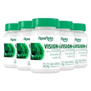 Kit 5 Vision+A Luteína e Zeaxantina Apisnutri 60 Cápsulas Sobre o produto A Zeaxantina e a Luteína possuem propriedades antioxidantes, portanto, ajudam a nos proteger contra os danos causados pelos radicais livres nas partes do organismo onde elas estão presentes, como por exemplo nos olhos. Modo de usar Ingerir 1 cápsula ao dia. Recomendação de uso: 19 dezenove anos ou acima. Ingredientes Ingredientes: Ácido ascórbico, monometionina de zinco, luteína da flor de Tagetes erecta, DL-alfa-tocoferol acetato, bisglicinato de cobre, zeaxantina, acetato de retinol, e lubrificante talco USP. Cápsula: gelatina e água deionizada. NÃO CONTÉM GLÚTEN. este produto não é um . não exceder a recomendação diária de consumo indicada na embalagem. mantenha fora do alcance de crianças. este produto não deve ser consumido por gestantes, lactantes e crianças. Manter a embalagem bem fechada e em local seco e fresco. Não expor a luz solar. Consumir em até 60 dias após aberto. Isento de registro no M.S. Conforme RDC 240/2018. Apresentação Classificação: Suplemento alimentar de Luteína e Zeaxantina em cápsulas Quantidade de cápsulas: 60 cápsulas de 480mg Peso Líquido: 28,8g Marca: Não Informado