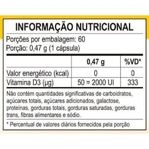 A Vitamina D3 2000 UI Colecalciferol Unilife 60 Cápsulas é um suplemento alimentar desenvolvido com ingredientes cuidadosamente selecionados para garantir qualidade e pureza. Cada cápsula contém colecalciferol Vitamina D3 , proporcionando uma opção prática para complementar a alimentação diária. A cápsula é composta por gelatina vegetariana e água, tornando o produto adequado para diferentes perfis de consumo. Ingredientes Colecalciferol Vitamina D3 , amido modificado, gelatina vegetariana e água Informações adicionais Não contém glúten Não contém lactose Produto vegano Modo de uso Sugere-se a ingestão de 1 cápsula ao dia, preferencialmente após a refeição, ingerida com líquido. Informação nutricional Cada porção de 0,5 g 1 cápsula contém 50 mcg 2000 UI de Vitamina D3, correspondendo a 100% da necessidade diária recomendada. Armazenamento Manter em local seco e fresco, ao abrigo da luz e umidade. Após aberto, consumir dentro do prazo de validade indicado na embalagem. Marca: Não Informado