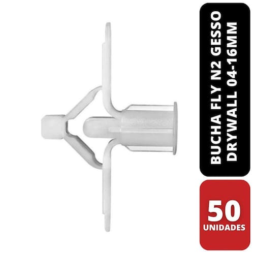 Conteúdo:Pacote com 50 unidades.Descrição:- Utilizam-se parafusos tipo madeira ou chipboard.- Produzida com poliamida de alta qualidade.Indicação:Indicada para todos os tipos de materiais ocos: placas de gesso, drywall, forro e teto de gesso.Diâmetro do furo:10 mm.Espessura do material base:04 - 16 mm.Diâmetro do parafuso:4,0 - 4,5 mm.Comprimento da bucha:35 mm.DICA IMPORTANTE:- O comprimento do parafuso deve ser o comprimento da bucha mais a espessura do objeto a ser fixado. - Para fixação de objetos no teto, não exceder carga superior a 3 Kgf por ponto de fixação. O espaçamento entre os pontos de fixação deve ter no mínimo 60 cm.