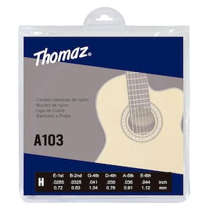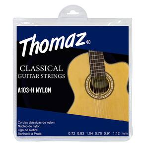 Jogo com 6 cordas clássicas de nylon sendo 3 com revestimento em liga de cobre banhado a prata e 3 em nylon transparente, ideal para iniciantes.Especificações - Marca: Thomaz- Modelo: A103-H- Aplicação: ViolãoE-1ª – 0.0285 inch | 0.72 mmB-2ª – 0.0325 inch | 0.83 mmG-4ª – 0.041 inch | 1.04 mmD-4ª – 0.030 inch | 0.76 mmA-5ª – 0.036 inch | 0.91 mmE-6ª – 0.044 inch | 1.12 mmConteúdo da Embalagem - 50 Jogos de Encordoamento Violão Nylon 103H Thomaz- Dimensões da Embalagem (AxLxP): 9 x 14 x 20 cm*Imagens meramente ilustrativas