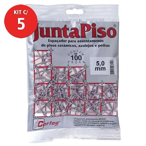 ** KIT EXCLUSIVO COM 500 UNIDADES **Espaçador juntapiso 5mm CortagConteúdo: 5 Pacote com 100 unidades. Aplicação/ Características: Proporciona assentamento alinhado; Reduz o tempo de colocação do revestimento. Funciona como anti-dilatador, evitando o possível deslocamento das peças cerâmicas.Material/ Composição:Polipropileno.Vantagens:- Reduz o tempo de colocação do revestimento; - Funciona como anti-dilatador, evitando o possível deslocamento das peças cerâmicas.Cor: Cinza.Tamanho: 5 mm.Comprimento: 28 mm.Largura: 5 mm. Altura: 3 mm. Marca: CortagCódigo: KIT-51749-5