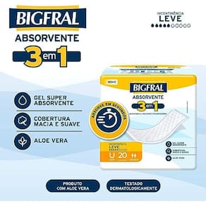 O Absorvente Bigfral 3 em 1 foi desenvolvido para incontinência leve a moderada. Absorve em segundos e possui uma cobertura macia e suave com aloe vera