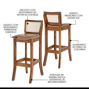 CARACTERÍSTICAS TÉCNICAS: - Produzido em Madeira Maciça Sustentável - Acabamento em Verniz na cor Imbuia - Encosto com Revestimento em Rattan com Fibra Sintética Quadriculada na cor Bege - Assento Estofado Preenchido com Espuma D23 - Assento com Revestimento em Tecido Impermeável na cor Caramelo L85 - Banqueta Entregue Montada *Kit Composto por SEIS Banquetas