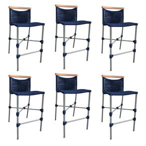 Kit 6 Banquetas Anne em Corda Náutica Base em Alumínio Cinza com Detalhe em Madeira Azul Marinho