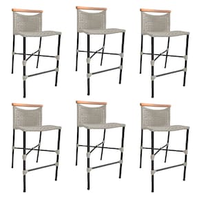 Kit 6 Banquetas Anne em Corda Náutica Base em Alumínio Preta com Detalhe em Madeira Areia - Bege