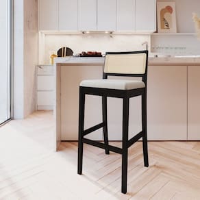 Banqueta bar com estrutura de madeira maciça de reflorestamento, assento estofado e encosto com palha natural de algodão. Os diferentes materiais aplicados nesta banqueta empregam na peça um visual elegante e acolhedor. A palha natural do encosto é o destaque, trazendo leveza e conforto ao