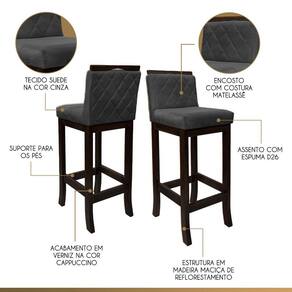 Apresentamos a banqueta Nice, feita com madeira maciça de reflorestamento e acabamento em verniz. Seu assento preenchido com espuma D26 e encosto com espuma D23 garantem conforto duradouro. O encanto adicional vem da costura matelassê no encosto, enquanto o revestimento em suede adiciona uma sensação de luxo. Adapta-se perfeitamente a qualquer espaço, adicionando elegância e conforto instantaneamente. CARACTERÍTICAS TÉCNICAS: - Produzido em Madeira Maciça de Reflorestamento; - Acabamento em Verniz na cor Capuccino; - Assento Preenchido com Espuma D26; - Encosto Preenchido com Espuma D23; - Encosto com Costura Matelassê; - Revestimento em Suede na cor Cinza. *Indicada para Bancadas/Mesas com Alt. 90/95 cm. *PRODUTO ENVIADO MONTADO. INFORMAÇÕES TÉCNICAS: Altura Total: 92 cm Altura até Assento: 65 cm Altura até Travessa: 13 cm Altura Encosto: 35 cm Largura Assento: 38 cm Largura Estrutura: 36 cm Profundidade Total: 42 cm Profundidade Assento: 41 cm Peso: 7 kg *Kit Composto por 6 Banquetas Nice. INFORMAÇÕES ADICIONAIS:ATENÇÃO: Móvel produzido em madeira maciça natural podendo ocorrer mudança no tom da madeira conforme o produto;*Conferir se o produto está de acordo com o que comprou, produto danificado não será aceito troca;**As imagens ambientadas são meramente ilustrativas e podem apresentar itens que não compõe o produto. As cores do produto podem variar de acordo com o monitor, a iluminação do ambiente ou sua percepção visual;***Limpeza deve ser feita com pano macio e seco ou levemente umedecido com água e sabão neutro. Não devem ser utilizados abrasivos como palha de aço e objetos cortantes;Garantia para defeitos de fabricação conforme Código de Defesa do Consumidor. Marca: CCS Interiores