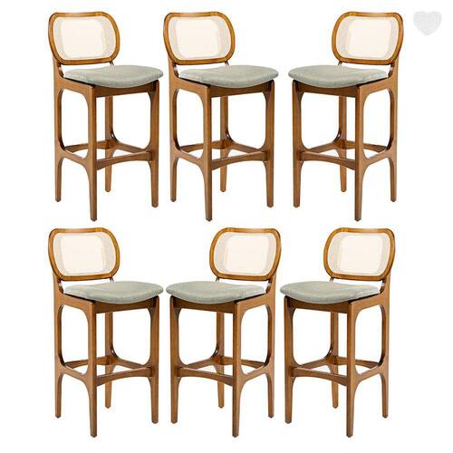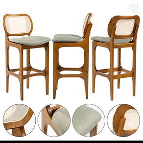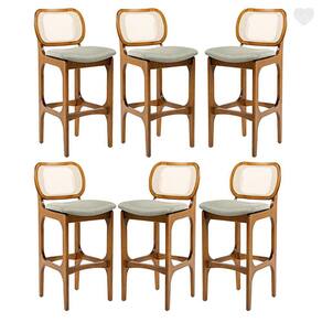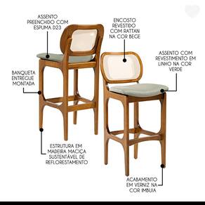 A Banqueta Alta Decor é o modelo ideal para complementar o seu ambiente. Dispõe de um design atual com assento estofado e encosto em rattan. As banquetas são móveis versáteis que podem ser utilizados em diversos ambientes e funcionalidades, petindo composições na decoração e agregando conforto e sofisticação ao ambiente. Podem ser utilizadas em bancadas de salas conjugadas, mesas bistrô em sacadas gourmet ou aonde você precisar. Produzida com madeira maciça, garantindo a sua durabilidade e vida útil. CARACTERÍSTICA TÉCNICAS: - Produzido em Madeira Maciça Sustentável - Acabamento em Verniz na cor Imbuia - Assento Estofado Preenchido com Espuma D23 - Encosto com Revestimento em Rattan em Fibra de Algodão Sextavada na cor Bege - Tecido de Alta Qualidade em Linho na cor Verde L84 - Banqueta Entregue Montado * Kit Composto por SEIS Banquetas INFORMAÇÕES TÉCNICAS: - Altura Total: 104 cm - Altura até o Assento: 75 cm - Largura Total: 50 cm - Profundidade Total: 54 cm Informações Adicionais: Garantia para defeitos de fabricação conforme Código de Defesa do Consumidor. *ATENÇÃO: Não nos responsabilizamos pela montagem, subir ou içar o móvel. *As imagens ambientadas são meramente ilustrativas e podem apresentar itens que não compõe o produto, as cores do produto podem variar de acordo com o monitor, a iluminação do ambiente ou sua percepção visual. *Limpeza: Deve ser feita com pano macio e seco ou levemente umedecido com água e sabão neutro. Não devem ser utilizados abrasivos. Marca: Império das Banquetas