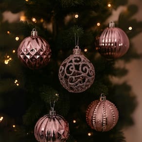 Deixe sua árvore de Natal ainda mais elegante com este kit de 6 bolas decorativas rosê gold, em um mix de modelos metalizados lisos e arabescos vazados com glitter, criando um efeito sofisticado e harmonioso.