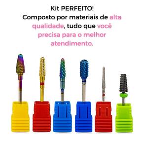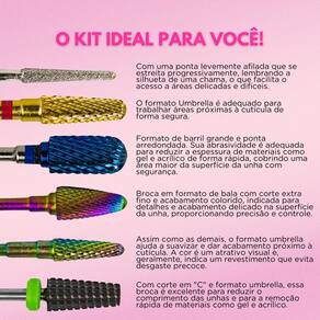 Características Principais: - Cortes Super Fino, Fino, Médio e Grosso; - Kit com 6 Unidades; - Modelo Flame S (F) 720; - Modelo F-Gold Medium Umbrella; - Modelo M-Blue Large Barrel Ball ST; - Modelo Broca C Umbrella TRL Bit; - Modelo M Colourful Medium Umbrella ST; - Modelo XF Colourful Bullet ST; - Ideal para todas as áreas e processos; - Não danifica as unhas naturais; - Perfeita para alongamentos de unhas, e acabamentos; - Garante precisão; - Acabamentos detalhados.
