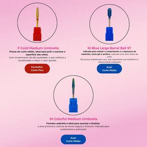 F-Gold Medium Umbrella: Possui um corte médio, ideal para polir e suavizar a superfície das unhas. A cor dourada indica que ela possui revestimento de alta qualidade, o que melhora a durabilidade e reduz o calor gerado. O formato de guarda-chuva é adequado para trabalhar áreas próximas à cutícula de forma segura.