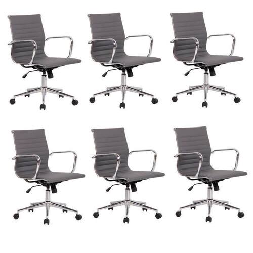 Conjunto com 6 cadeiras office com encosto baixo, estrutura em aço cromado e revestida em PU, possui regulagem de altura do assento (mínimo 89cm e máximo 98cm) com pistão á gás e sistema relax, possui base giratória em aço cromado com rodízios em nylon. Altura do Conjunto: 89 cm Ambiente: null Ambiente Principal: Escritório Cor: Cinza Informação Complementar: 1x Conjunto 2 Cadeiras Poliuretano Office Sevilha Móveis Cinza Largura: 59 cm Altura: 89 cm Peso: 9,1 kg Profundidade: 59 cm Necessita Montagem: Sim