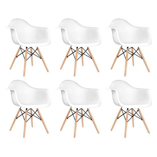 Kit 6 Poltronas Eames De Madeira Com Braço Daw Com Assento BrancoAs Cadeiras Charles Eames Daw - Com Braços ? Design são uma ótima escolha para fazer parte de cômodos como sala de jantar, área de recreação e lazer, entre outros locais. Elas são ideais para quem está em busca de conforto e um design único. Um diferencial importante destas cadeiras é que elas possuem uma base de madeira e o seu assento em polipropileno, sendo materiais que trazem mais resistência à cadeira e um toque de estilo a mais no modelo.- Essa cadeira suporta até 120 quilos.- Garantia de 3 meses contra defeitos de fabricação.- Assento em polipropileno e pés em madeira.LIMPEZAUtilize um pano macio levemente úmido.MEDIDASCor: BrancoAltura ? 79,5 cmLargura - 62 cmProfundidade - 62 cm*As imagens são meramente ilustrativas e podem sofrer variações de cor e pequenos detalhes de acordo com o seu monitor, iluminação do ambiente e até mesmo a sua percepção visual.