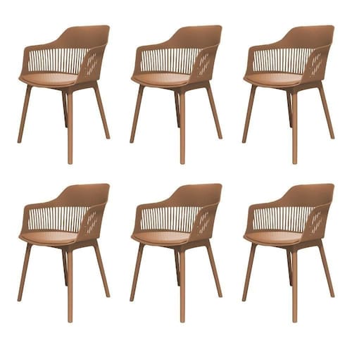 Cor: Marrom Capuccino | Materiais: Polipropileno | Estilo de Decoração: Moderno | Linha: Montreal | Marca: Fratini | Peso Suportado (kg): 120.00 | Tipo de Base: Fixa | Atributos: Confortável, Elegante, Versátil | Área de Uso: Interna | (tempo): 6 meses | (descritivo): contra defeitos de fabricação de 06 meses. Consulte as nossas políticas. | Peso (kg): 45.00 | Medidas: Largura (cm): 58.00 | Medidas: Profundidade (cm): 55.00 | Medidas: Altura (cm): 83.00 | Medidas: Altura até o Assento (cm): 46.00 | Possui Braços?: Sim | Possui Manual de Montagem?: Acompanha o Produto | Origem do Produto: Importado | Conservação e Manutenção: Limpeza com pano úmido em solução de água e detergente neutro. Secar em seguida. | Acabamento: Fosco | Tipo de Encosto: Fixo | Estado de Origem: SP | Conteúdo da Embalagem: 06 Cadeiras | Produto: Kit 6 Cadeiras Montreal Marcela Fratini Almofada em PU Estrutura em Polipropileno Marrom Capuccino | Tonalidade: Marrom | Ambiente indicado: Salas | Material da estrutura: Plástico | Montagem: Desmontado | Capacidade de Peso: 120.00