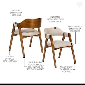 Olá! Você está buscando uma cadeira que seja o destaque do seu ambiente? Então, você precisa conhecer a Cadeira Lua! Com um design moderno e elegante, ela é capaz de conceder maior conforto a qualquer espaço. Além de sua beleza estética, a Cadeira Lua é incrivelmente versátil e pode ser usada em diversos ambientes da sua casa, trazendo um toque único a cada um deles. Produzida com madeira maciça sustentável de alta qualidade e resistência, você pode ter certeza de que esta cadeira durará por muitos anos. Não perca mais tempo procurando a cadeira perfeita. Então não perca mais tempo e venha conhecer nosso catálogo e deixar sua casa mais completa e cheia de estilo com todos os produtos da Rio Madeira Interiores. CARACTERÍSTICAS TÉCNICAS: - Produzido em Madeira Maciça Sustentável - Acabamento em Verniz na cor Imbuia - Assento Estofado Preenchido com Espuma D23 - Encosto Estofado Preenchido com Espuma D18 - Tecido de Alta Qualidade em Linho Bege L59 - Cadeira Entregue Semi Montada *Kit Composto por SEIS Cadeiras INFORMAÇÕES TÉCNICAS: Altura Total: 80 cm Altura Chão até Braço: 69 cm Altura Chão até Assento: 50 cm Altura Encosto: 32 cm Largura Total: 62 cm Largura do Assento: 55 cm Profundidade Total: 57 cm Profundidade Assento: 53 cm Peso: 8 kg INFORMAÇÕES ADICIONAIS: Garantia para defeitos de fabricação conforme Código de Defesa do Consumidor. - Produto em madeira maciça natural, podendo ocorrer variação no tom ou cor da madeira. - As imagens ambientadas são meramente ilustrativas e podem apresentar itens que não compõe o produto, as cores do produto podem variar de acordo com o monitor, a iluminação do ambiente ou sua percepção visual. - Limpeza: Deve ser feita com pano macio e seco ou levemente umedecido com água e sabão neutro. Não devem ser utilizados abrasivos. Marca: Rio Madeira Interiores