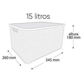 Kit 6 Caixas Organizadoras Rattan PRETA 15 Litros Arqplast Kit 6 Caixas Organizadoras Rattan PRETA 15 Litros ArqplastAixa organizadora em plástico com tampa, que facilita a organização De guarda roupas e armários, por ser uma peça charmosa expor em Ambientes abertos dá um toque especial a decoração. Combina com vários ambientes, como cozinha, sala, banheiro e quarto. Material - Polipropileno DescriçãoDimensões:345 X 255 X 700mm (Corpo) 365 X 275 X 140mm (Tampa) (comprimento x largura x altura) medida do produtoDimensões: 345 X 260 X 180mm (comprimento x largura x altura)