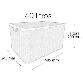 Kit 6 Caixas Organizadoras Rattan PRETA 40 Litros Arqplast Kit 6 Caixas Organizadoras Rattan PRETA 40 Litros Arqplast Caixa organizadora em plástico com tampa, que facilita a organização De guarda roupas e armários, por ser uma peça charmosa expor em Ambientes abertos dá um toque especial a decoração. Combina com vários ambientes, como cozinha, sala, banheiro e quarto. Material - Polipropileno DescriçãoDimensões:480 X 340 X 890mm (Corpo) 505 X 370 X 165mm (Tampa) (comprimento x largura x altura) medida do produtoDimensões: 485 X 345 X 290mm (comprimento x largura x altura)