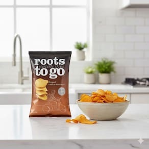 Raízes direto da fazenda para você - os chips de batata-doce roots to go oferecem crocância irresistível e o sabor natural da batata-doce em um snack leve e delicioso.