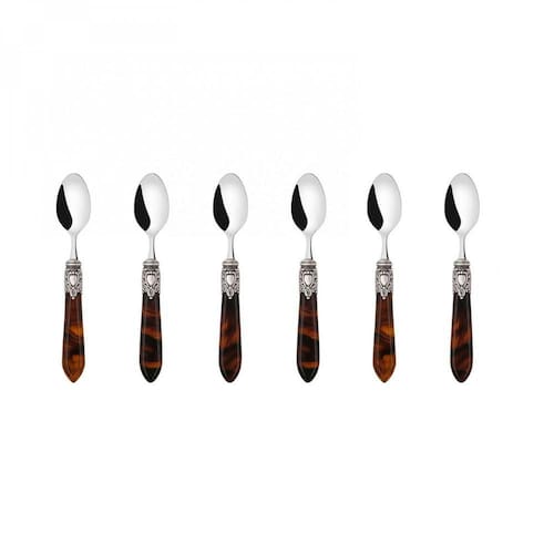 Para garantir uma mesa elegante e com espírito régio o jogo de colheres para sobremesa da linha Oxford da Bugatti foi produzido em aço inox 18/10, com cabo de madrepérolaem acrílico enriquecido por um sofisticado anel com acabamento em prata antiga que lembra um nobre brasão.