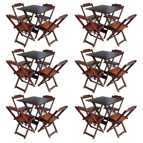 Kit 6 Conjuntos De Mesa Com 4 Cadeiras De Madeira Dobravel 70x70 Imbuia é ideal para bares, restaurantes, estabelecimentos, áreas de lazer e tambem para sua casa. Feito em madeira maciça, tornando resistentes e duráveis. Seu design permite que seja encaixado em qualquer ambiente, trazendo um toque a mais para seu estabelecimento. Além de sua durabilidade, o que lhe trará conforto para servir seus clientes. Por ser dobrável torna-se mais fácil guardar, manusear e limpar o produto. Atenção: EVITE USAR PRODUTOS ABRASIVOS E QUíMICOS PARA LIMPEZA DO PRODUTO, aconselha-se o uso de pano umedecido para melhor conservação; mantenha o produto fora de chuva e sol constantes MESA Cor: Imbuia Modelo: Dobravel Dimensões: Altura 76cm | Largura 70cm | Profundidade 70cm CADEIRA Cor: Imbuia Modelo: Dobravel Dimensões: Altura 80cm | Largura 45cm | Profundidade 42cm