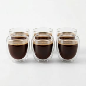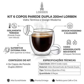 • Material: Vidro borossilicato de alta resistência • Capacidade: 200ml • Quantidade: 6 unidades • Tipo: Parede dupla com câmara de ar